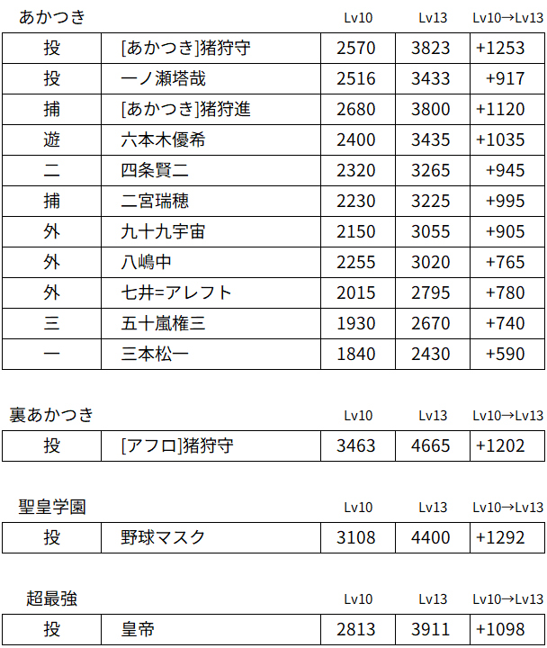 投手は出場機会が少ないのでLv.13まで育てるのは難しそうだけど、打撃成績がよければ1試合で一気に経験値を稼げるぞ!