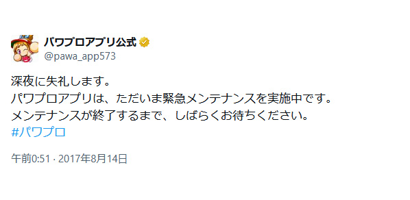 メンテナンスが終了するまで、しばらくお待ちください。#パワプロ— パワプロアプリ公式 (@pawa_app573) August 13, 2017